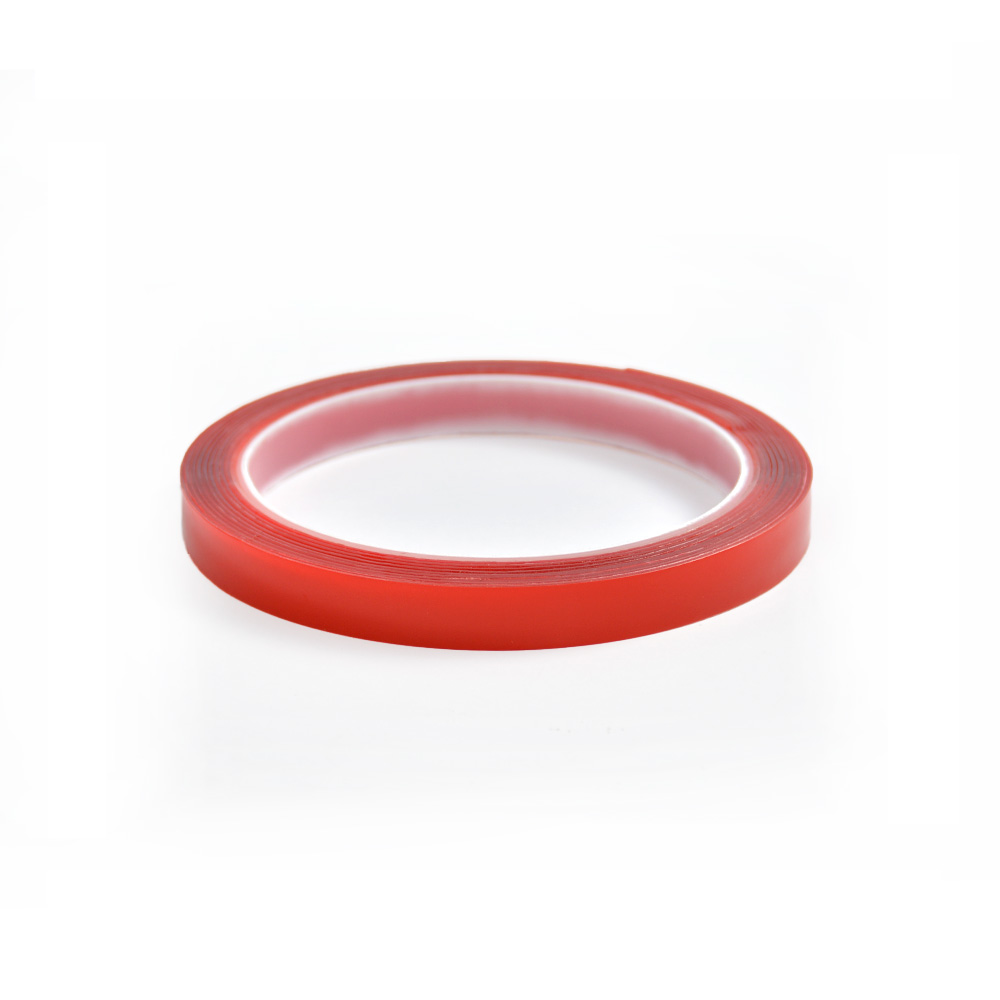 Cinta doble faz roja de 1 cm x 3 metros, ideal para fijaciones rápidas y precisas en trabajos de calzado, manualidades y uso general.